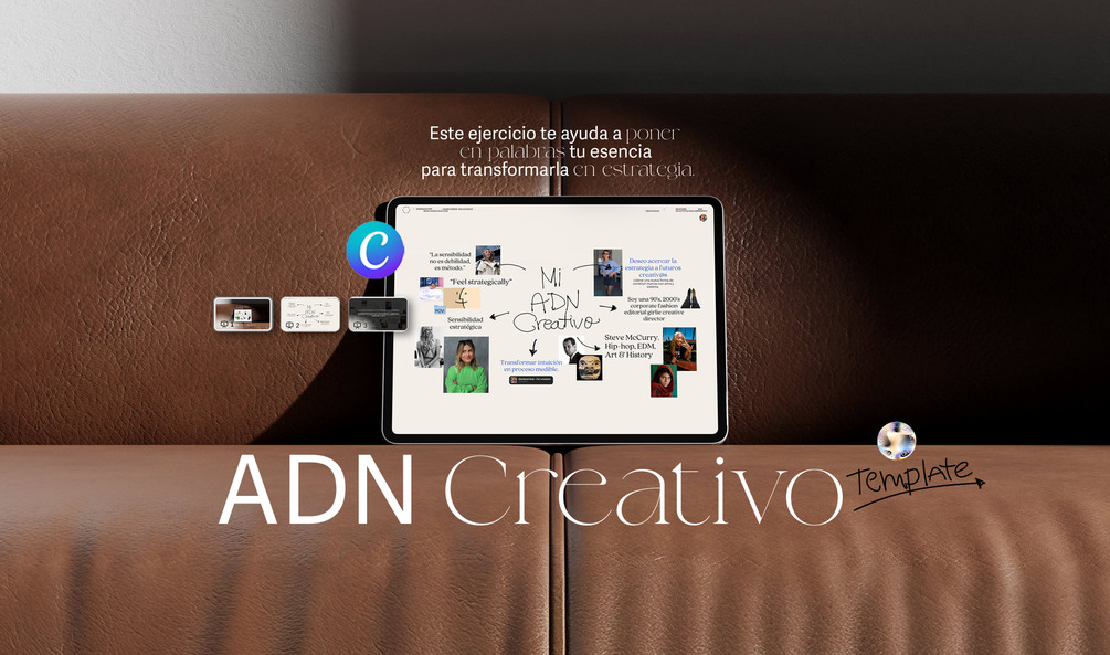 Esta plantilla de Canva está diseñada para ayudarte a identificar y poner en palabras tu ADN creativo: tus valores, frases, influencias y rasgos personales que definen tu forma de crear.